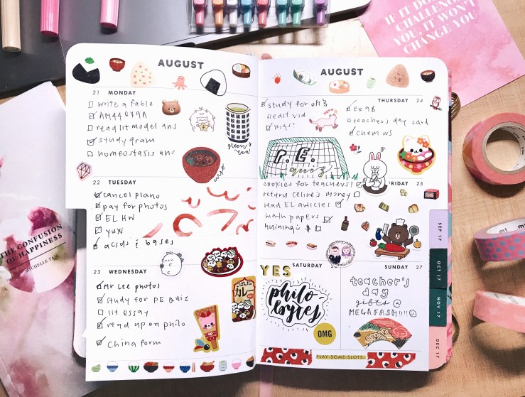 items in this picture: chinese notes, washi tape, mildliners, food stickers, sarasa milk colour pens