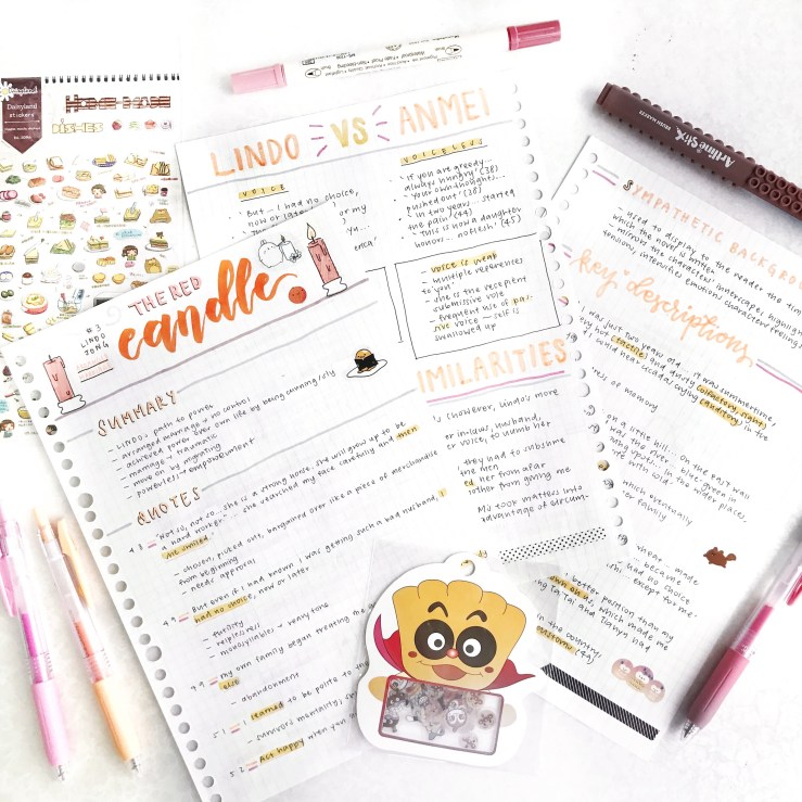 items in this picture: literature notes on june woo from the joy luck club, sarasa pen set, washi tapes, sticker sheet, jam jelly sticker pack