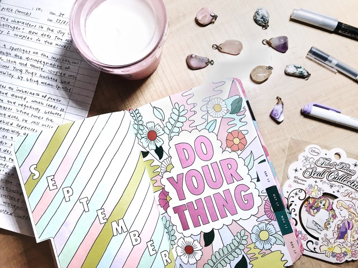 items: bando planner, rapunzel stickers, african gemstones, muji pen, kuretake metallic brush, mildliner, miniso candle, literature essay