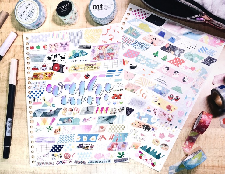 items: bookmark tabs, bujo, washi tapes, muji pens