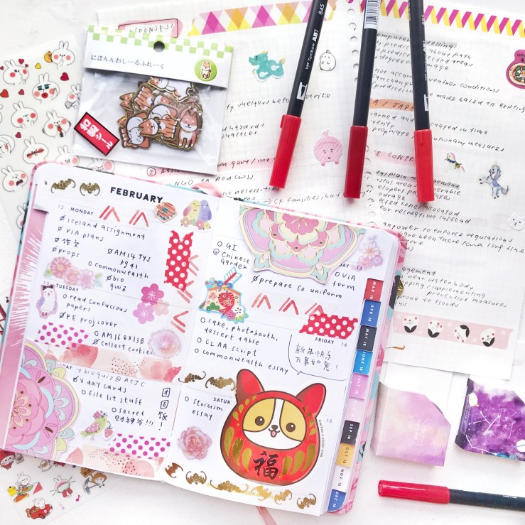 items: bujo, rabbit stickers, red tombows (carmine, chinese red, crimson, warm red), galaxy washi tapes, dog stickers, geography notes