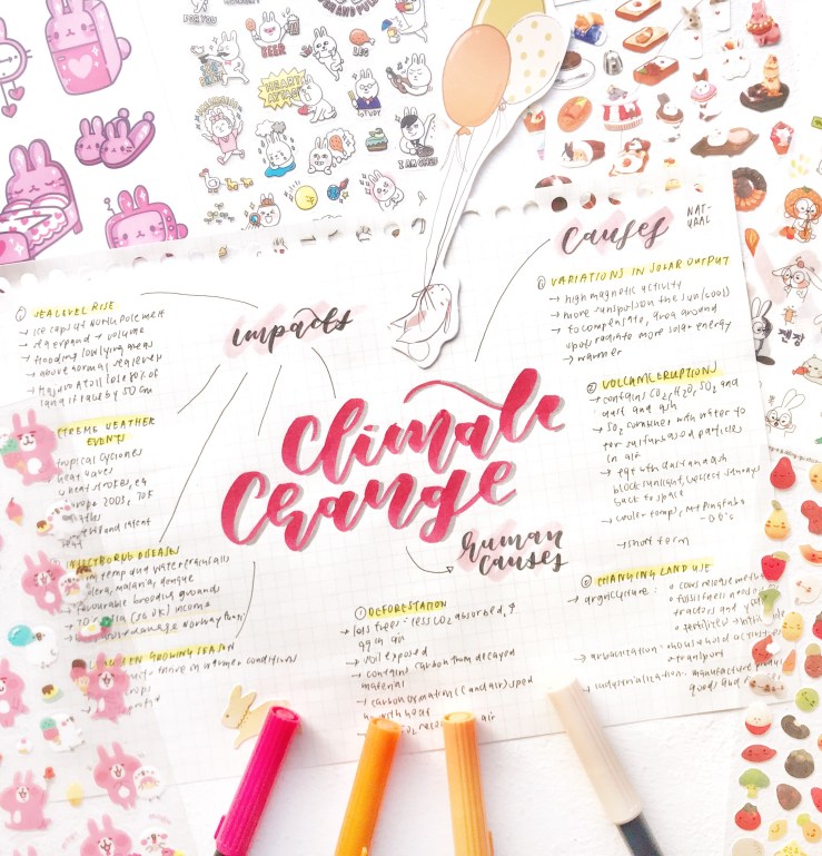 items in this picture: notes binder from muji, geography notes on mangroves and coasts, yellow, smoky blue and green mildliners, sticker box, macbook