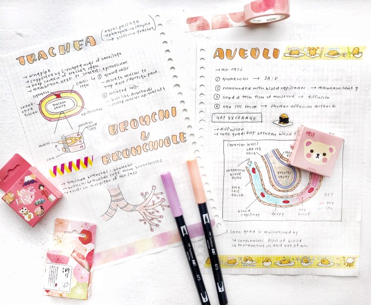 items: washi tapes, tombows (coral, orchid), sticker packs, biology notes