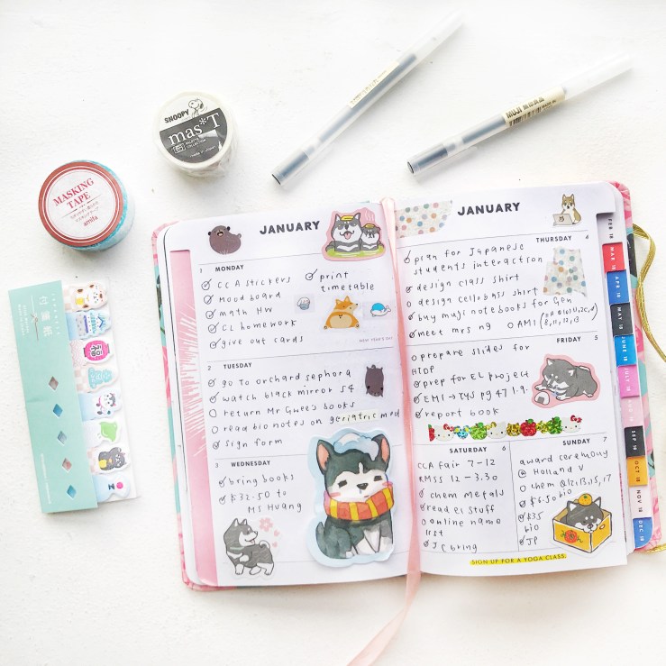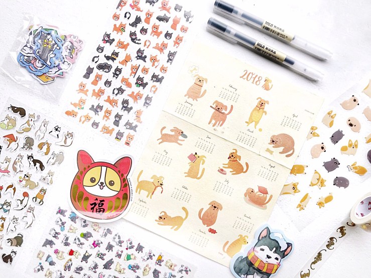 items: dog stickers, dog calendar, muji pens, washi tape, sticky note