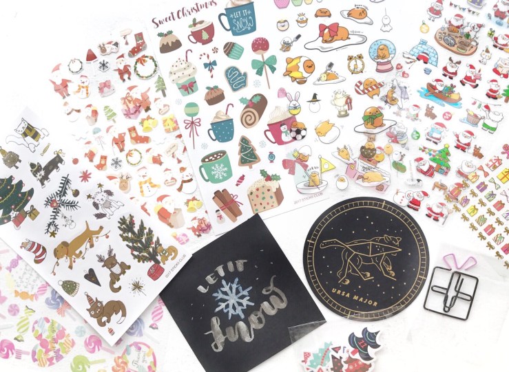 items: christmas stickers, christmas painted card, present paperclip, astrology bookmarks