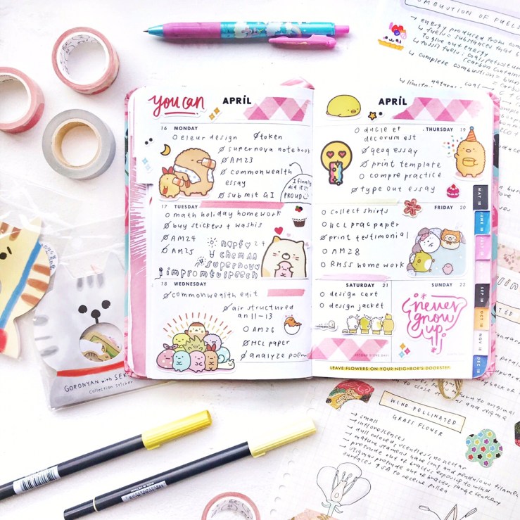 items in this picture: bullet journal, sakura sticky notes, washi tape, rilakkuma stickers, sumikko gurashi bookmark stickers, molang sticky notes, sarasa milk colour pens