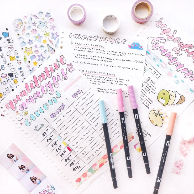 items: chemistry and biology notes, tombow bushes (sky blue, pink, orchid, coral), washi tapes, stickers, film strip