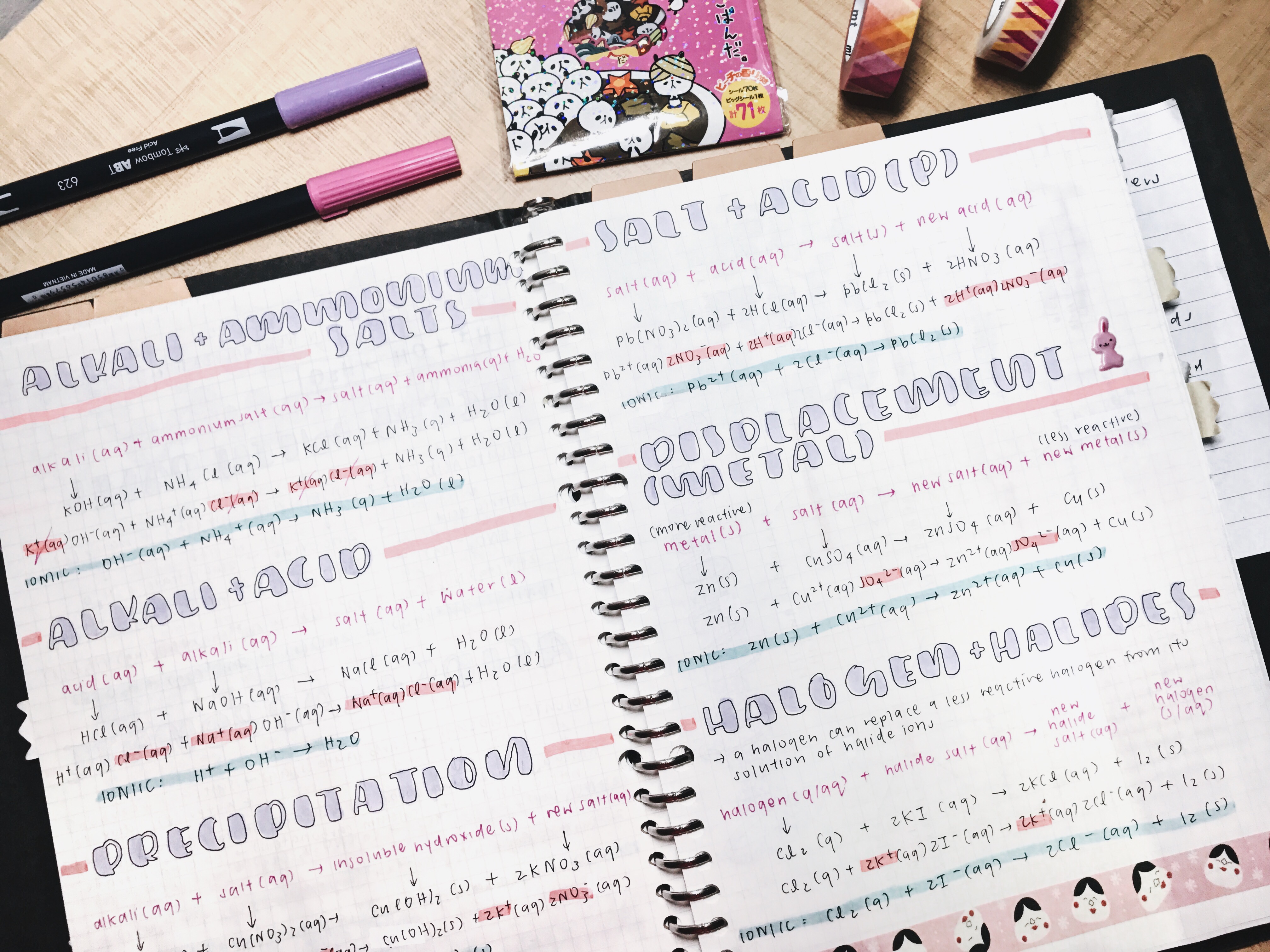 items: chemistry notes, muji binder, panda stickers, washi tape, tombow brushes