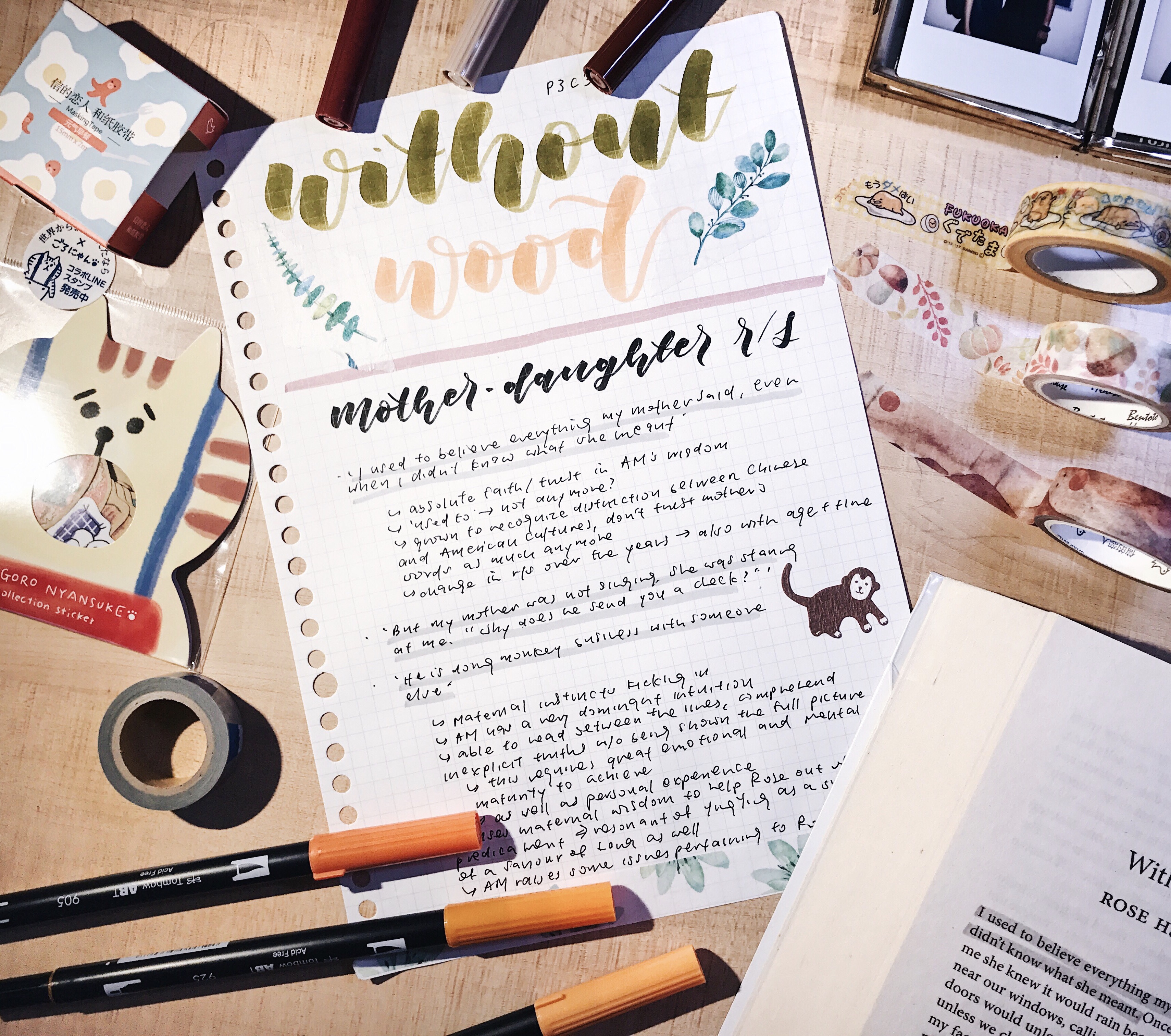 items: literature notes, tombow brushes, cat stickers, washi tape, joy luck club book, polaroid photo frame from urban outfitters