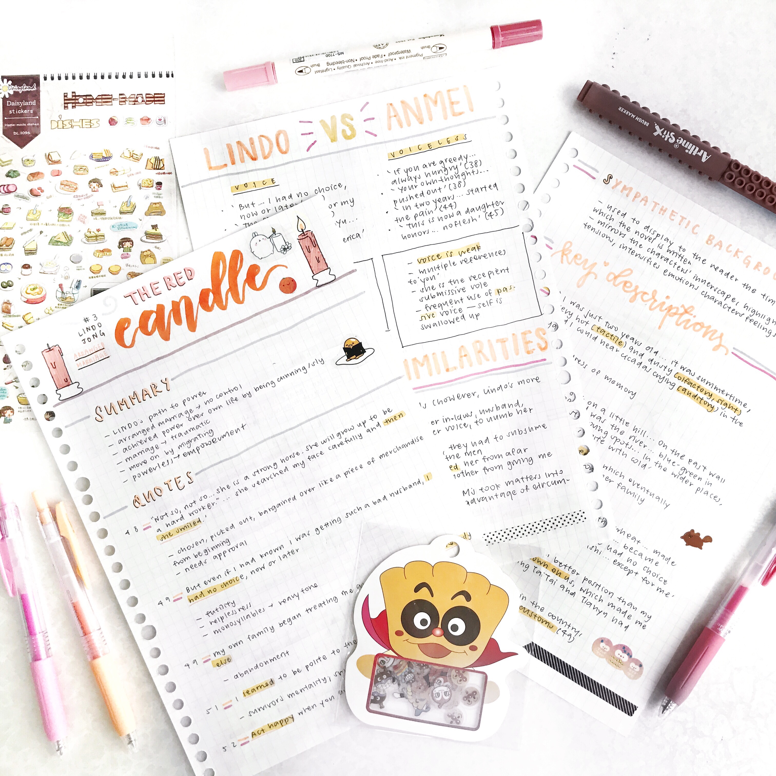 items in this picture: literature notes, sarasa mildliner pens, anpanman stickers, sandwich stickers, brushable pen, artline stix