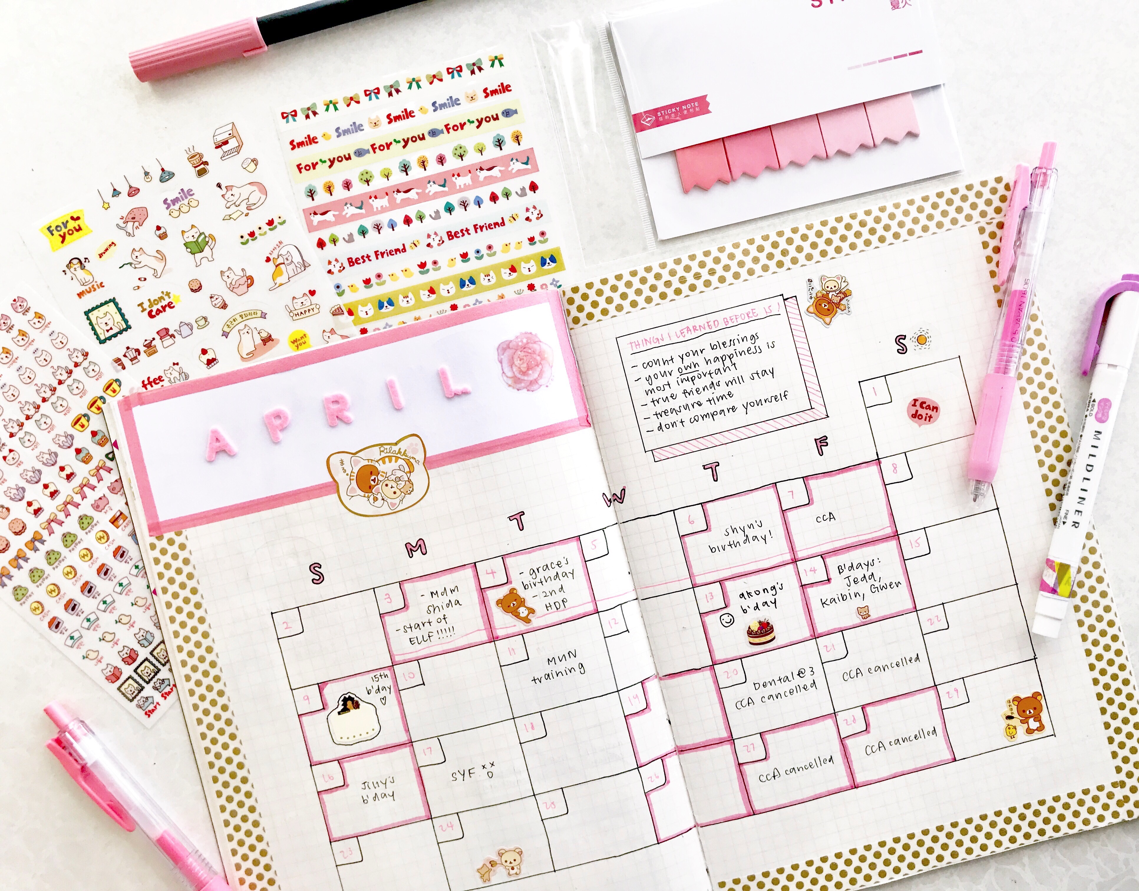 items: bujo, sarasa milk colour pen, stickers, bookmark stickers, mildliner, blush tombow brush