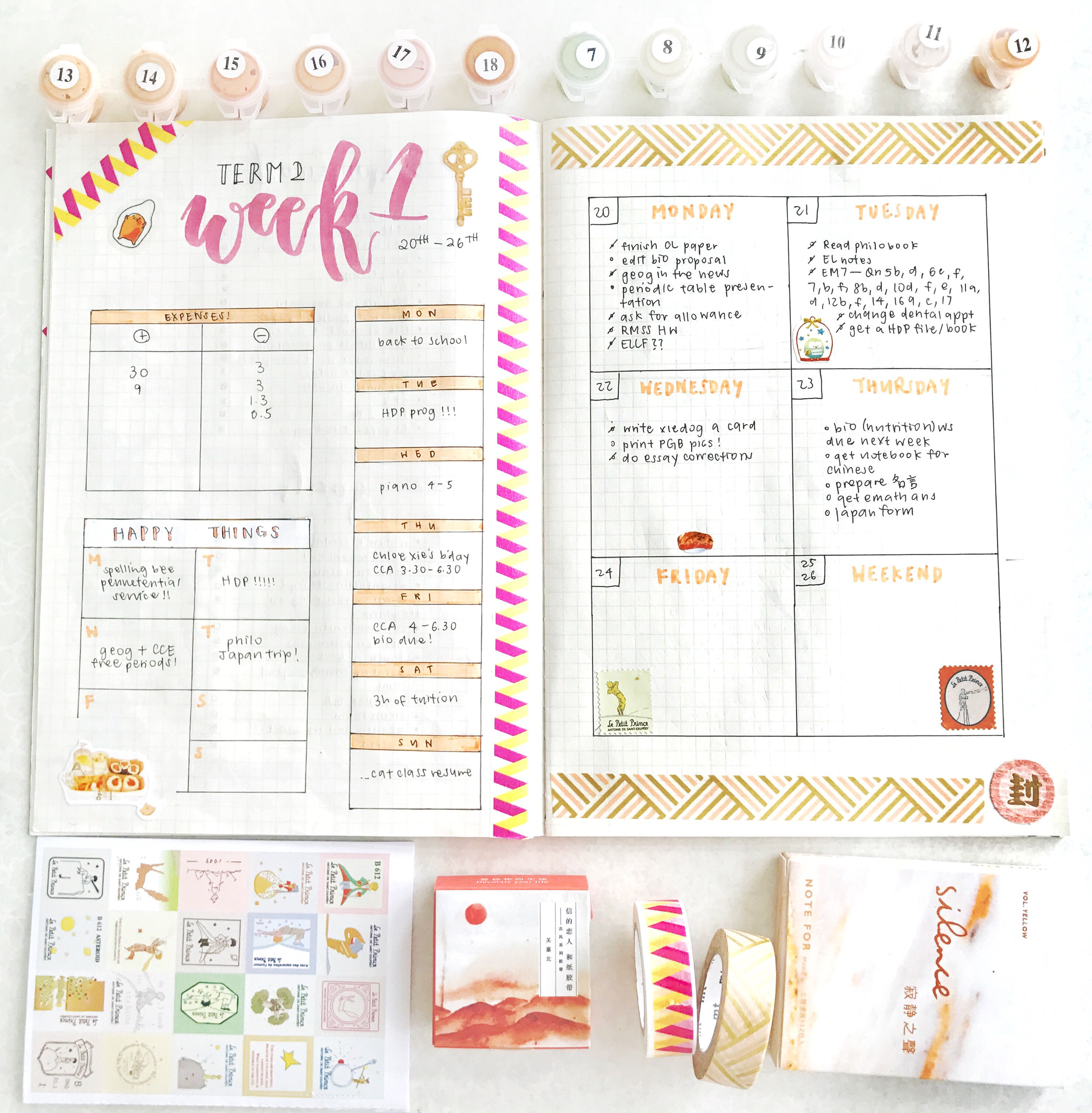 items in this picture: bujo weekly spread, mt washi tapes, memo pad, the little prince stickers, acrylic paint