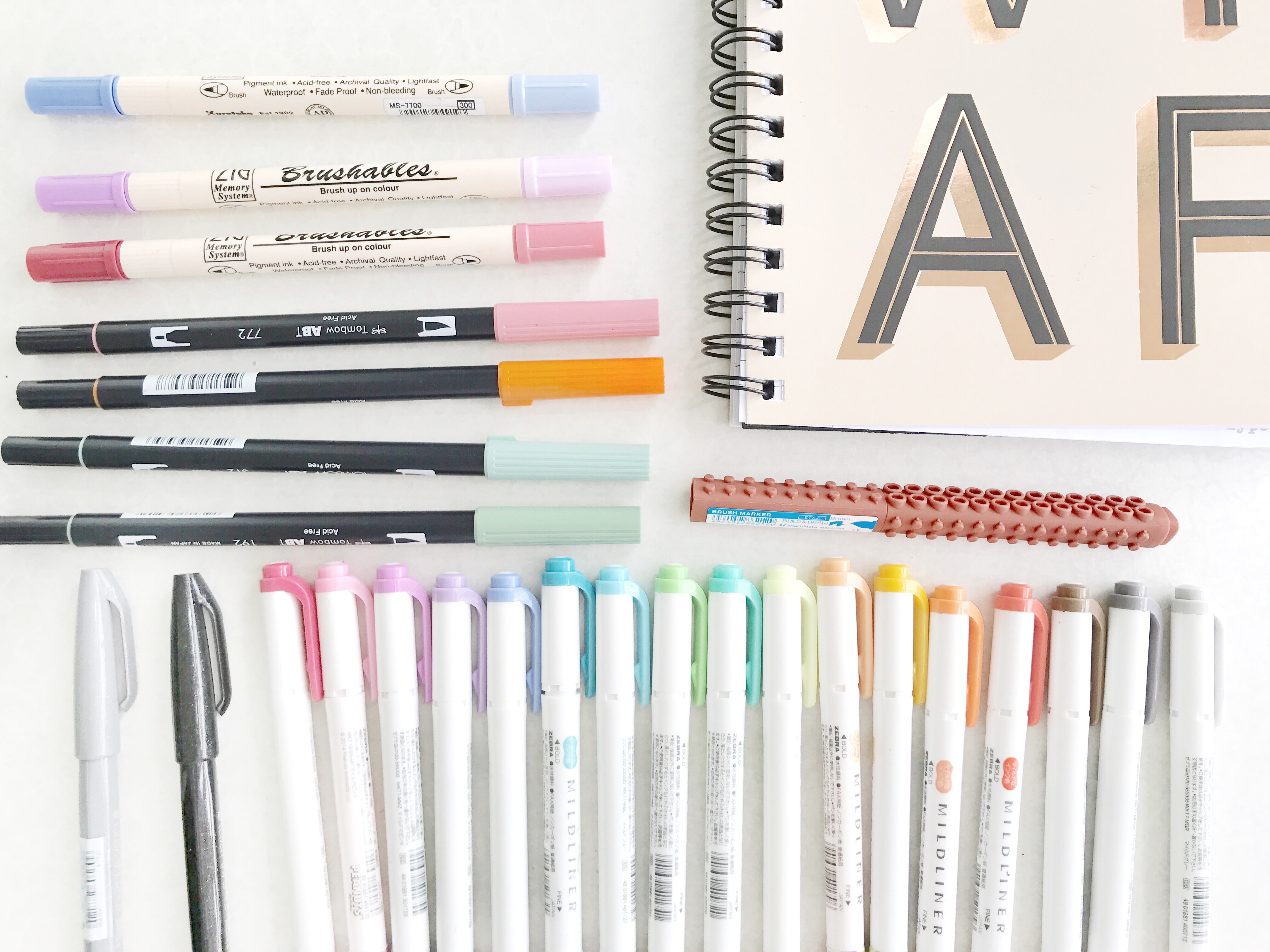 items in this picture: mildliner collection, pentel touch pens, tombow brushes, brushable pens, typo notebook, artline stix