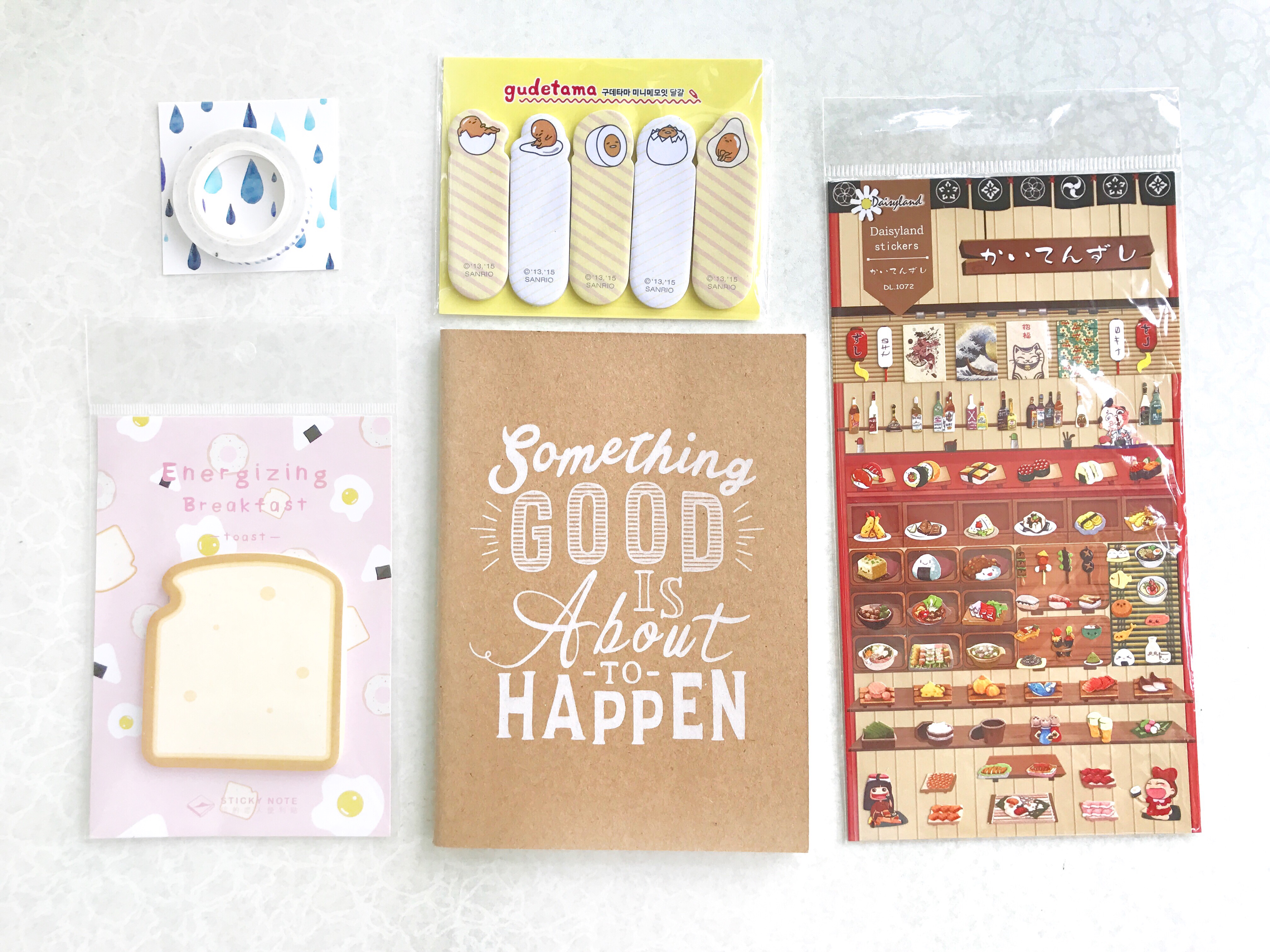 items in this picture: philosophy notebook, sushi stickers, bread memo pad, gudetama bookmark stickers, raindrop washi tape