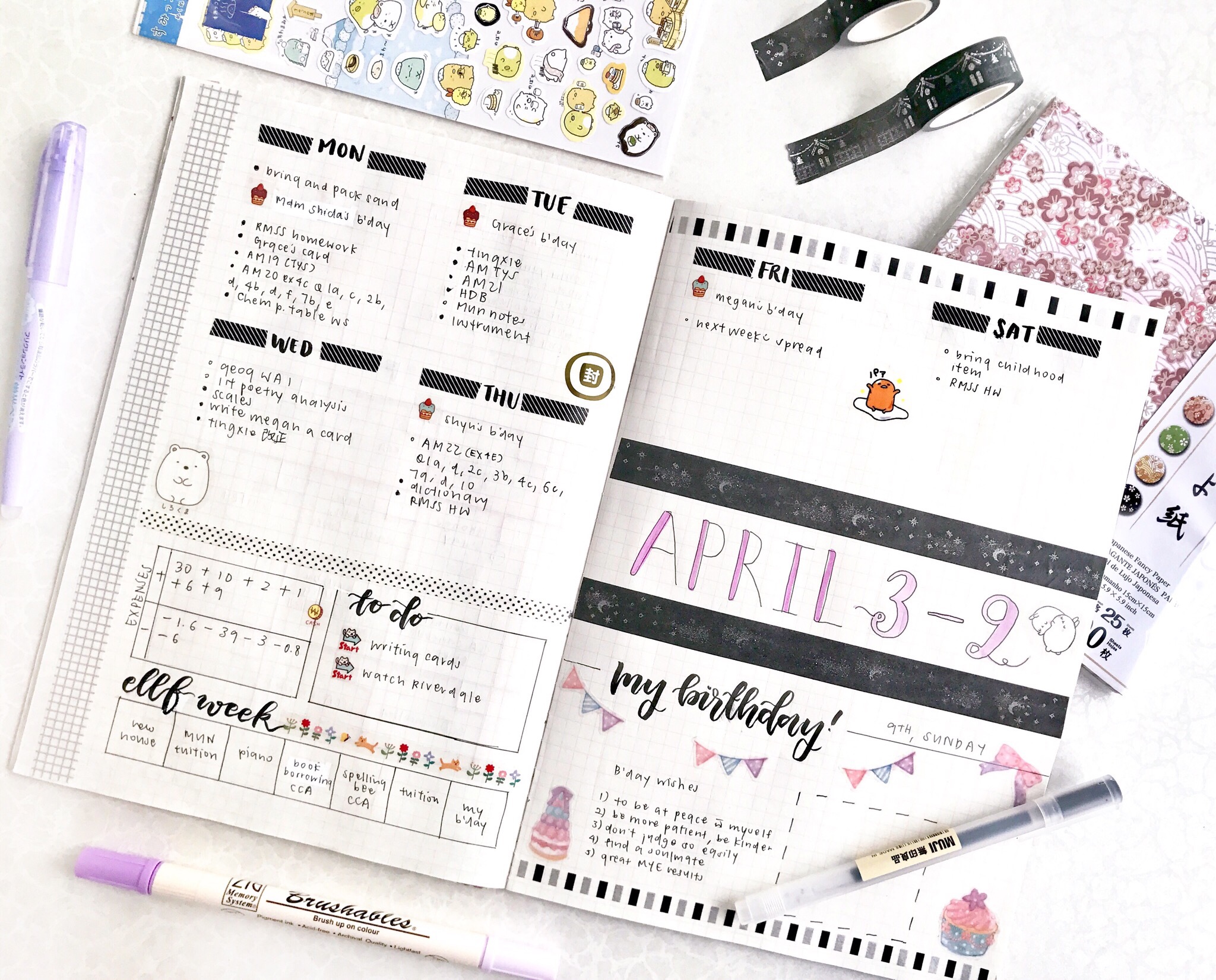 items: bujo, tombow brushes, stickers, washi tapes, SNAPS stickers