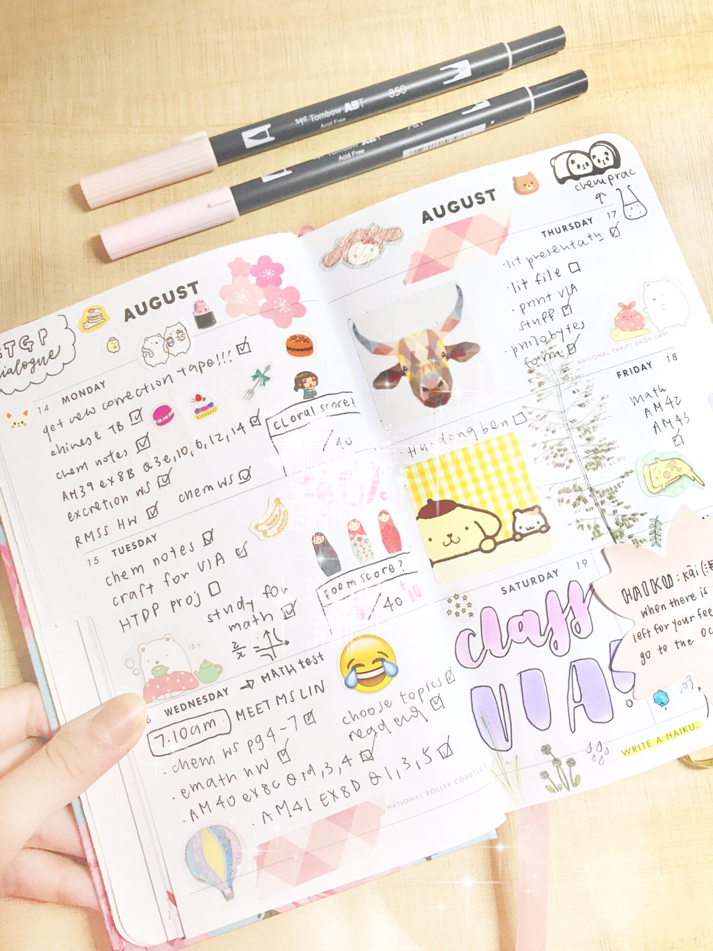 items: tombow, bujo, kumamon stickers, daiso stickers, chemistry notes, washi tapes